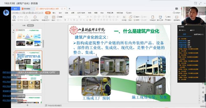建筑工程技术专业田召金老师在讲授《建筑产业现代化概论》课程时,课前制定详细的直播计划,精选优质课程资源,规划好时间节点,每15分钟左右进行一次互动,问题设计“短、小、精”,引导学生积极思考,激发学习兴趣,在获得知识的同时又能保持愉快的心情。