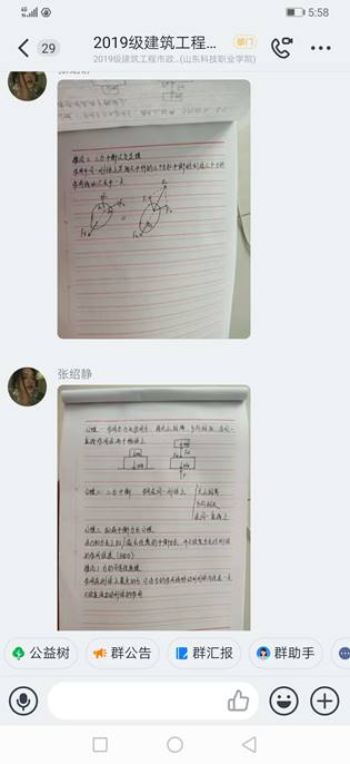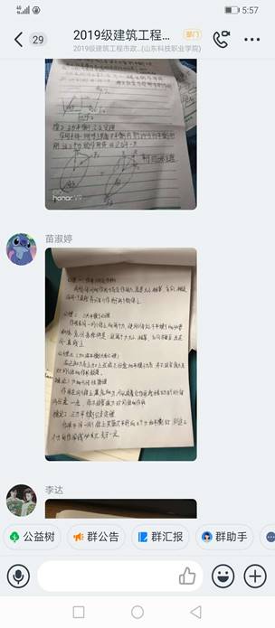 市政工程技术专业的王翠翠老师本学期讲授的是《工程力学》课程,利用钉钉直播、视频、互动等网络手段,开展线上教学,直播过程汇中,学生将练习内容在网络上进行展示,老师在线批改作业,师生互动较好,学习气氛活跃。