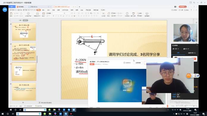 建筑工程技术专业王美艳老师本学期的课程是3+2试点班的《建筑力学与结构》。从说课开始,王老师就从“雷、神”抗疫说起,将思政教育融入专业内容中,将时下热点与课程内容结合起来说学习。同学们有意识的查阅这方面的资料,上课的时候发言很积极,对不知道的内容立刻上网查找。同时学生的信息化水平也很“专业”,上课时常常跟王老师分享直播的经验。同学们建议要手机和电脑一起开,电脑播放课件,直播过程,手机辅助发信息,手机信号不延时等等。