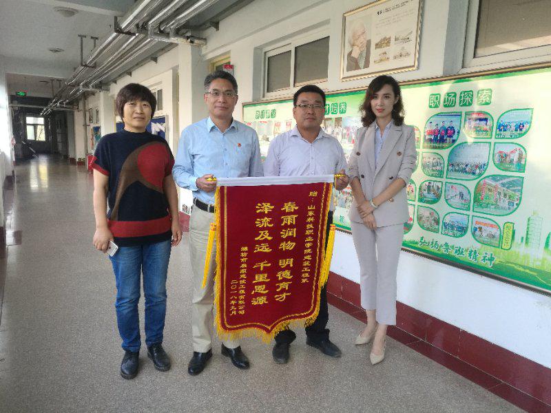 2018年9月28日,潍坊启顺建设工程有限公司刁友福总经理、办公室主任王圆圆专程到bv1946伟德赠送了锦旗与感谢信。感谢bv1946伟德在2018年7月份为他们公司输送了一批优秀学生实习,称赞学生认真遵守公司的规章制度,爱岗敬业、精益求精,体现了当代有志青年良好的精神风貌,得到公司上下的肯定与称赞。
