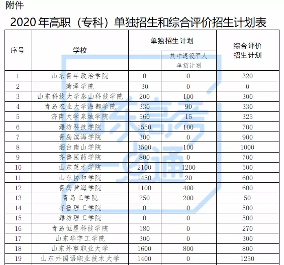 根据《山东省人民政府办公厅关于印发山东省深化高等学校考试招生综合改革试点方案的通知》(鲁政办发〔2018〕11号)、教育部等六部门关于印发《高职扩招专项工作实施方案》(教职成〔2019〕12号)的通知精神,按照中央关于做好新冠肺炎疫情防控工作的部署要求和省委、省政府工作要求,现就做好2020年高职(专科)单独招生和综合评价招生(含高职扩招)工作通知如下: