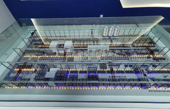 (三)混凝土预制构件生产沙盘:尺寸为2700mm*1500mm,以实际预制构件生产工厂场景为设计依据,将真实工厂实景整体缩影展现在学生老师面前,展现流动模台法生产线主要机械设备以及布置场景,同时展示装配式建筑工艺流程,体现模台流动过程及方向,最终将实际工厂的生产场景布局展现出来。
