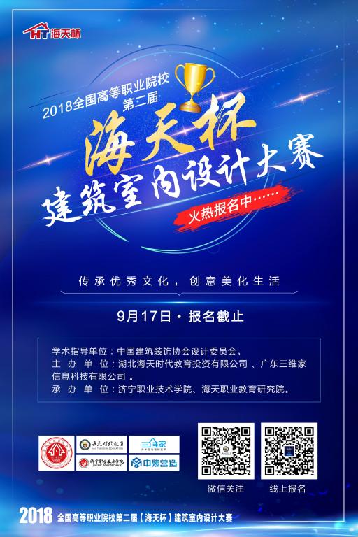 为了继续展示建筑类职业教育改革与发展的成果,进一步提升建筑室内设计专业建设水平,深化专业教学改革,提高专业人才培养质量,适应建筑装饰行业发展对人才的新需求。经研究,决定于2018年10月26 - 28日在山东济宁举办第二届“海天杯”建筑室内设计大赛,现将有关要求通知如下: