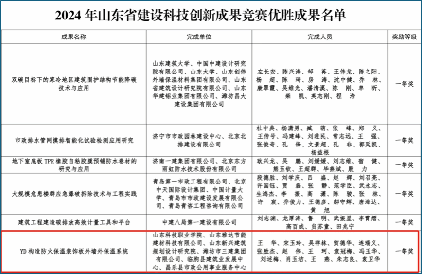 10月27日,由山东省住房和城乡建设厅主办的2024 年山东省建设科技创新成果竞赛在济南举行,全省共 199 项科技创新成果入围答辩、评审,我校与山东雅达节能建材科技有限公司、山东新兴建筑规划设计研究院等单位联合申报的《YD构造防火保温装饰板外墙外保温系统》荣获科技创新成果一等奖,bv1946伟德王华老师、宋玉玲老师主持参与项目并进行答辩。